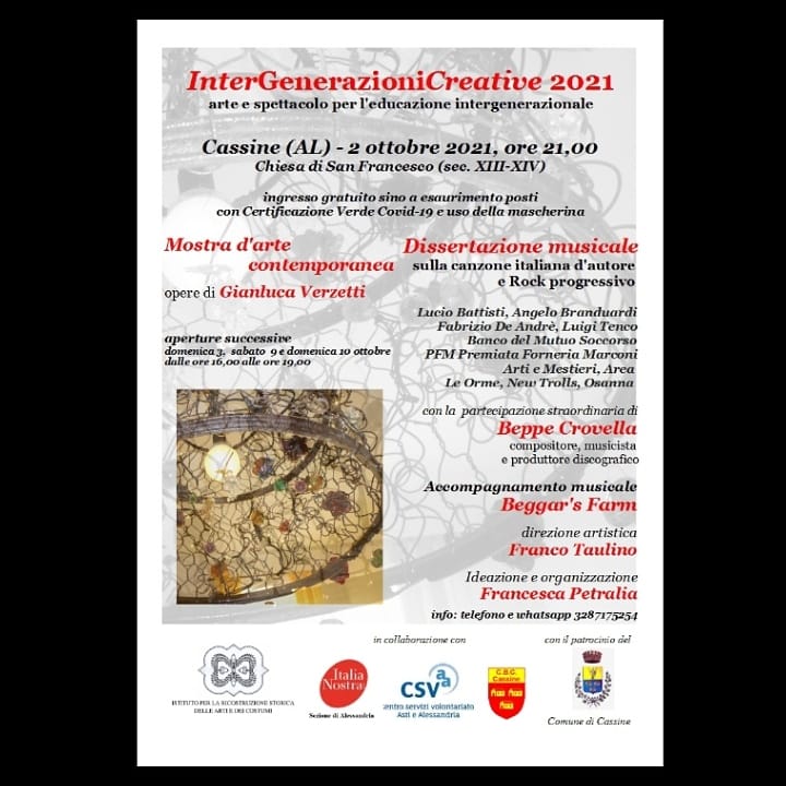 CASSINE (AL) sabato 2 ottobre 2021, alle ore 21,00 presso l'ex complesso conventuale di San Francesco si svolgerà l'appuntamento “Intergenerazionicreative 2021 - arte e spettacolo per l'educazione intergenerazionale” con l'inaugurazione di una mostra d'arte contemporanea e dissertazione musicale organizzato dall'IRSAC – Istituto per la Ricostruzione Storica delle Arti e dei Costumi APS di Cassine e la Sezione di Alessandria di Italia Nostra ONLUS in collaborazione con il CSVAA - Centro Servizi per il Volontariato di Alessandria e Asti e il Corpo Bandistico Cassinese “Francesco Solia” nonché con il patrocinio del Comune di Cassine.