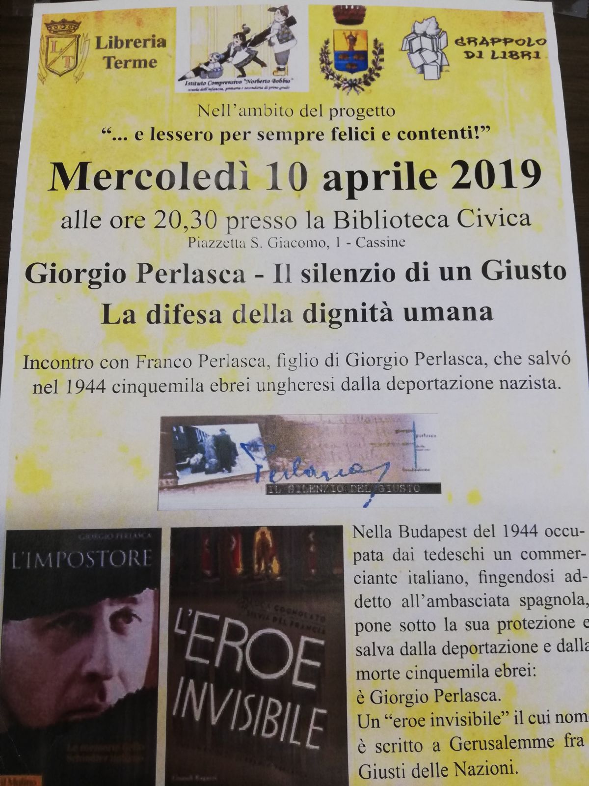 Nell'ambito del progetto "e lessero per sempre felici e contenti!" Mercoledì 10 Aprile ore 20,30 presso Biblioteca Civica incontro con Franco Perlasca, figlio di Giorgio Perlasca, che salvò nel 1944 cinquemila ebrei ungheresi dalla deportazione nazista.