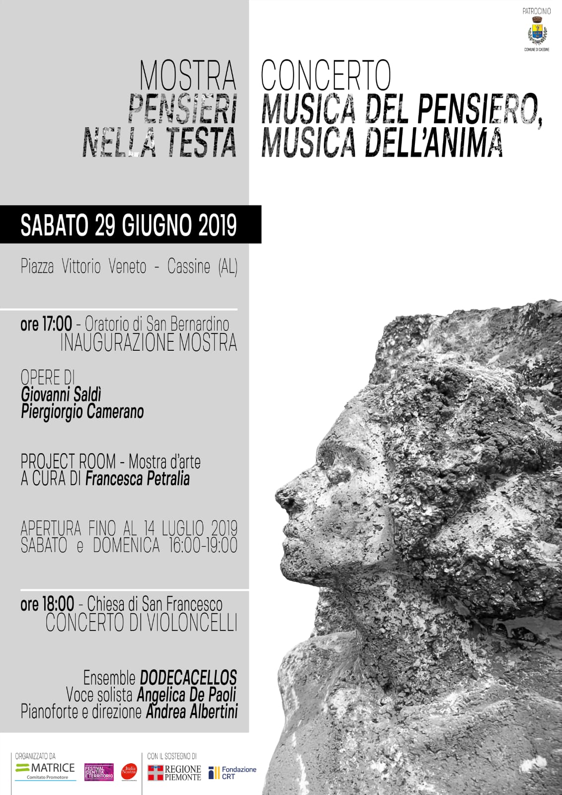 "Pensieri nella testa”, opere di Giovanni Saldì e Piergiorgio Camerano, mostra d'arte contemporanea a cura di Francesca Petralia nell’Oratorio San Bernardino, eletto come vera e propria Project Room di ricerca artistica, e “La Musica dell’Anima” concerto di violoncelli nell’adiacente Chiesa di San Francesco