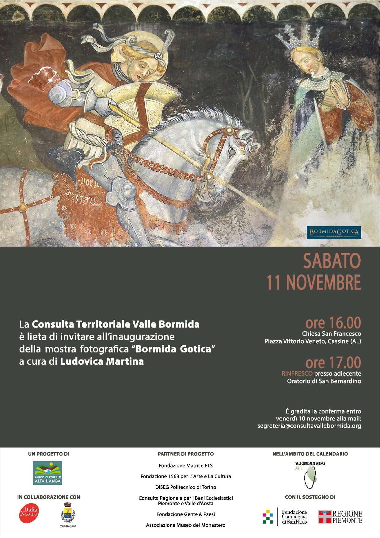 La mostra è un prologo dell’itinerario Bormida Gotica ideato e progettato per mettere in rete il patrimonio architettonico e storico-artistico del territorio che si estende lungo il fiume Bormida, dalle sorgenti liguri alla confluenza alessandrina nel Tanaro. Durante la presentazione, sarà illustrato il catalogo digitale (in lavorazione dallo Studio Alpi), importante contenitore dell’ingente lavoro di indagine svolto dalla storica dell’arte Ludovica Martina e aperto alla consultazione di studiosi e di appassionati di arte e architettura gotica e tardo gotica; un “dispositivo” facilmente accessibile che conterrà le ricerche storico-artistiche, le fonti bibliografiche e archivistiche.