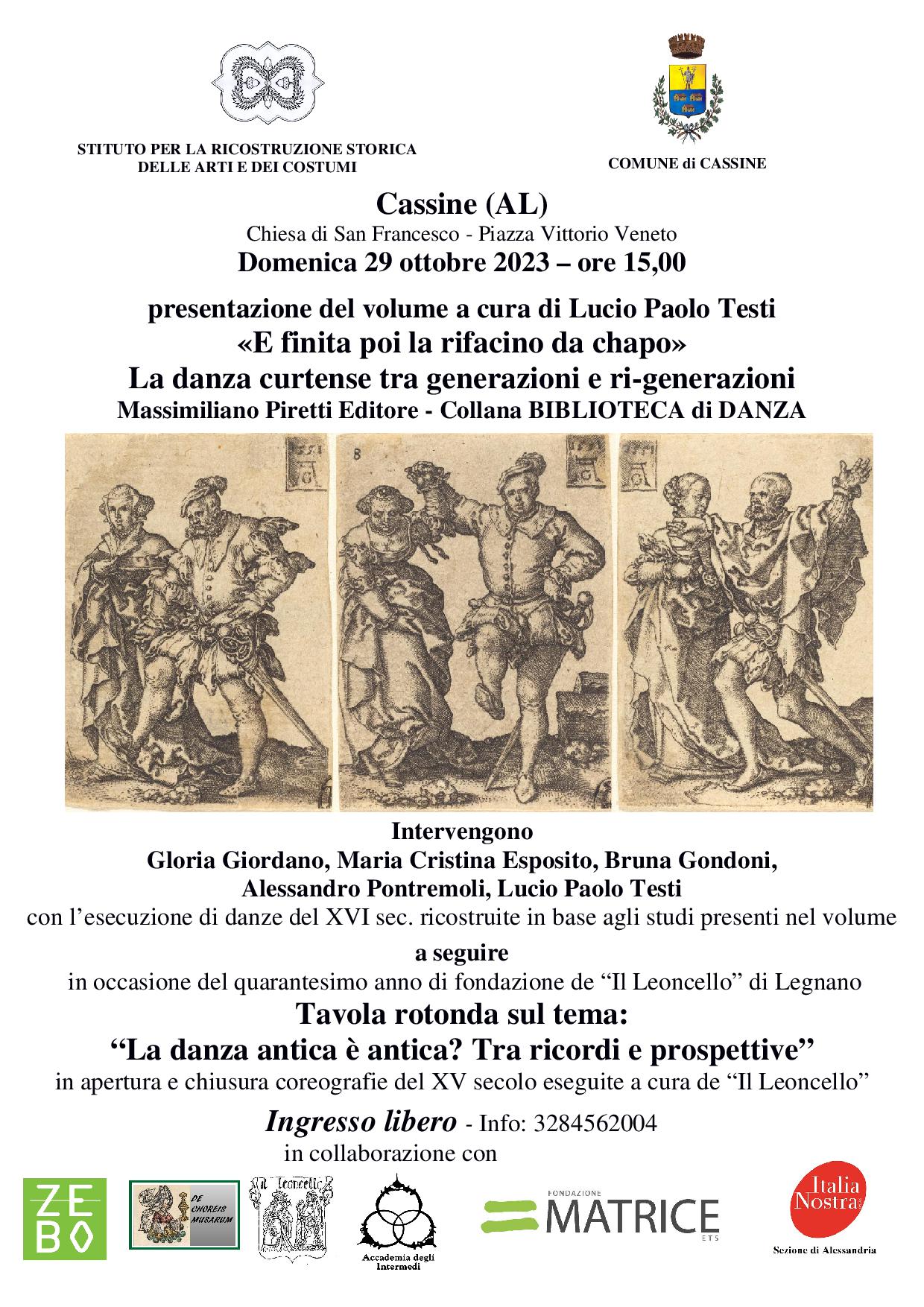 Cassine (AL) domenica 29 ottobre p.v., alle ore 15,00 presso la chiesa di San Francesco (sec. XIII-XIV) verrà presentato il volume «E finita poi la rifacino da chapo» La danza curtense tra generazioni e ri-generazioni, per la Collana Biblioteca di Danza - Massimiliano Piretti Editore, un ampio lavoro a cura di Lucio Paolo Testi con la prefazione di Alessandro Pontremoli e i contributi di Bruna Gondoni, Maria Cristina Esposito e Alessandro Pontremoli, oltre a quelli del curatore.