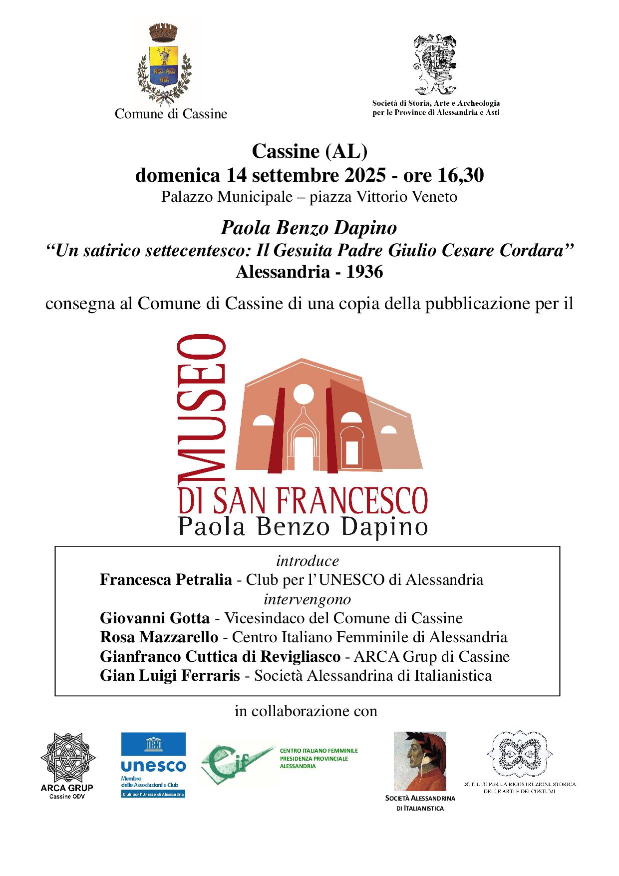 Presentazione e consegna del saggio: Un satirico settecentesco: Il Gesuita Padre Giulio Cesare Cordara” scritto da Paola Benzo Dapino