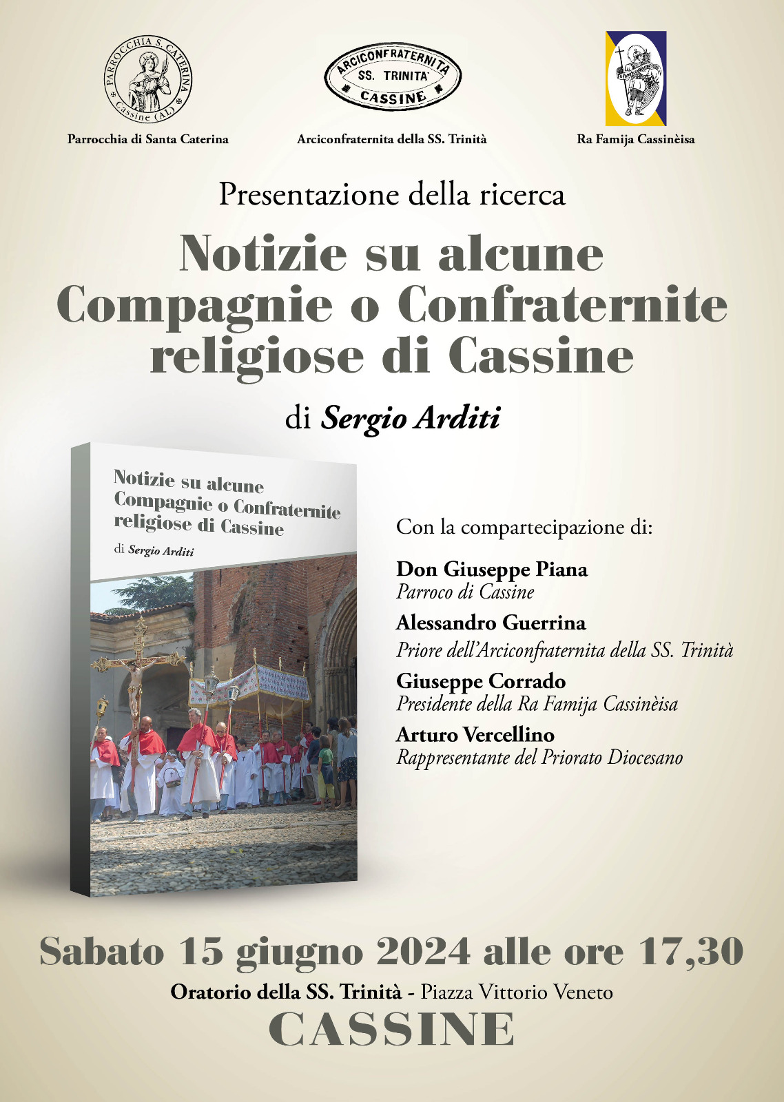 Presentazione della ricerca "Notizie su alcune Compagnie o Confraternite religiose di Cassine" di Sergio Arditi L'evento si svolgerà presso l'oratorio della Santissima Trinità alle ore 17,30 del 15 Giugno 2024