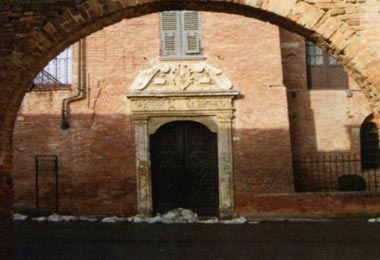 Al piano terreno vi è una restaurata bifora con decorazioni pittoriche.